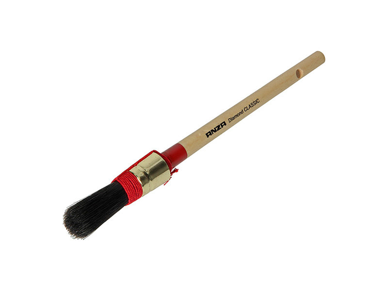 Is vloeibaar met een uitgekiende mix van zwart Varkenshaar en synthetische Vezels, met touwwoeling en geverniste beuken staal. De kop is vol-gekit met 2 componentenmateriaal om insijpelen uit te sluiten. De kwast is zeer functioneel en van hoogwaardige kwaliteit. Geschikt voor lakken op alkydbasis en alle producten op terpentijnbasis.