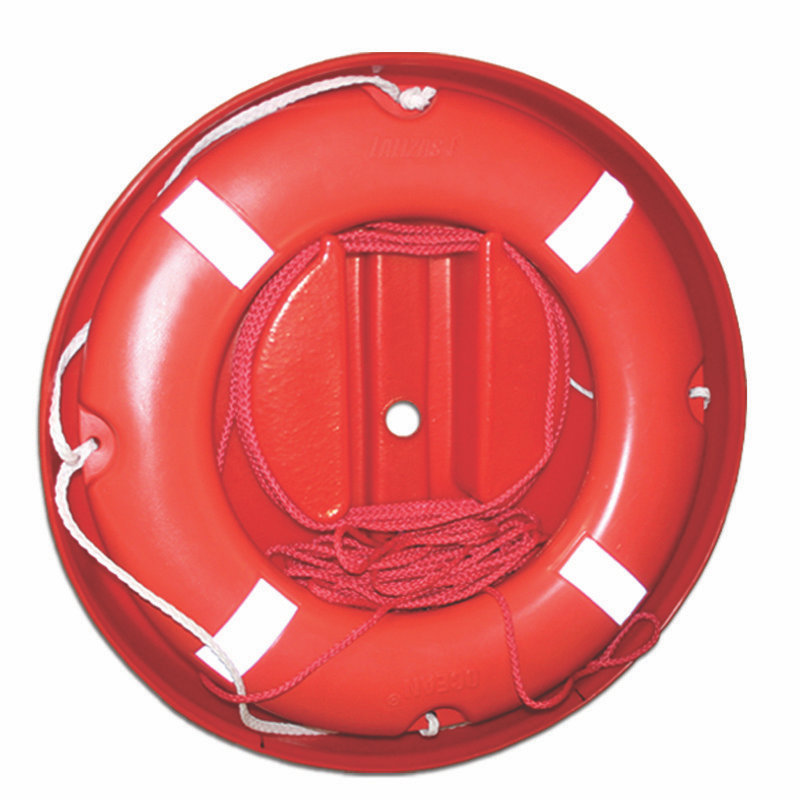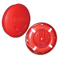 De container met deksel voor reddingsboei-ring Ø 60 of 75 cm heeft een transparante ronde opening om de aanwezigheid van de reddingsboei te controleren. Van duurzaam, slagvast en kleurvast kunststof met solide vergrendeling.