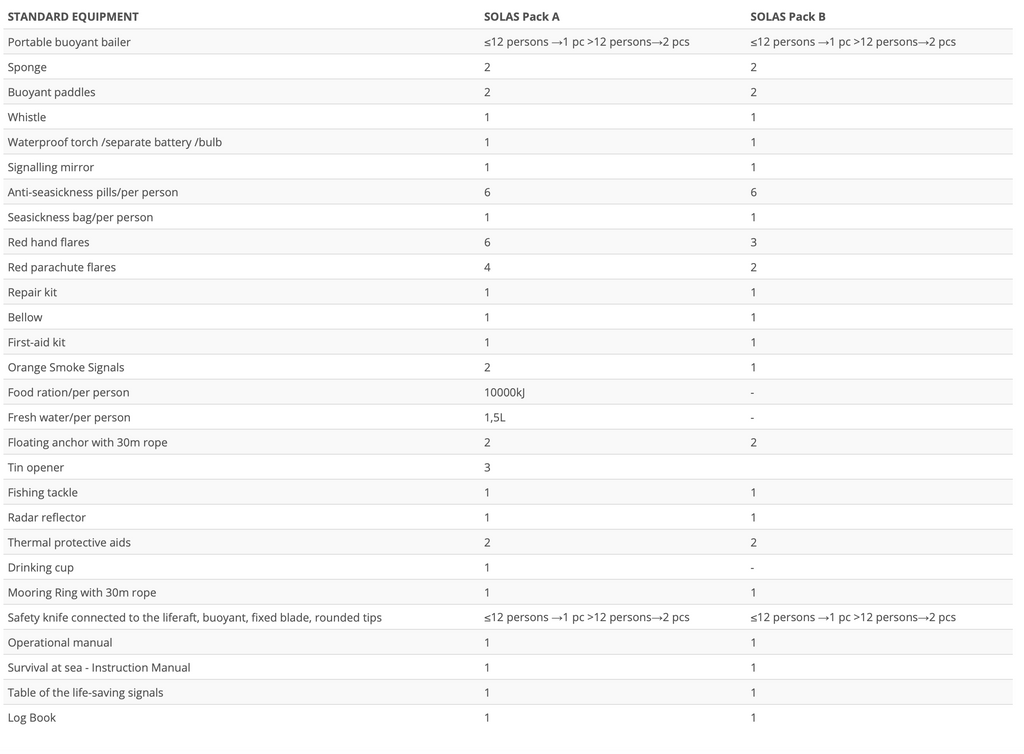 • Uitrustingspakketten: SOLAS-pakket A of SOLAS-pakket B